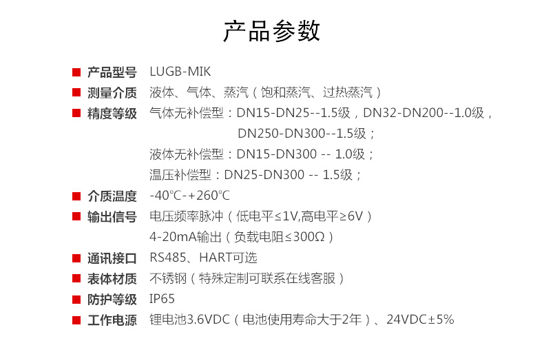 MIK-LUGB系列管道式涡街流量计的特点是压力损失小,量程范围大,精度高,在测量工况体积流量时几乎不受流体密度、压力、温度、粘度等参数的影响。无可动机械零件,因此可靠性高,维护量小。仪表参数能长期稳定。该款涡街流量计有模拟标准信号,也有数字脉冲信号输出,容易与计算机等数字系统配套使用,是一种比较先进、理想的测量仪器。
